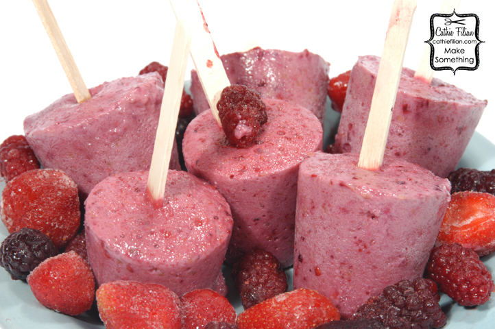 These frozen fruit popsicles are delicious, easy to make and a perfect treat when you need a sweet bite. I like using frozen berries and milk but you can also use fresh fruit and juice too. You can recycle the sticks over and over again. Just wash and dry. I rubber-band mine and keep them in a kitchen drawer.